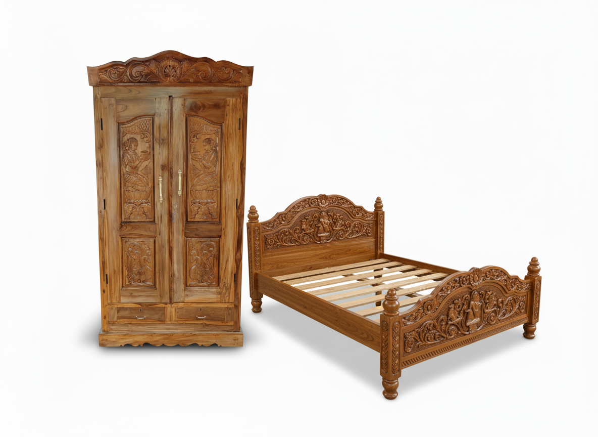 Experience the strength and beauty of a **pure solid teak wood bed**, handcrafted by skilled artisans for long-lasting durability. Teak is naturally termite-resistant, moisture-resistant, and one of the strongest woods used in premium furniture. Available in **King and Queen sizes**, with custom designs on request. Perfect for modern, classic, and South-Indian style bedrooms. This teakwood bed offers a premium finish, high stability, and long life—ideal for everyday comfort."